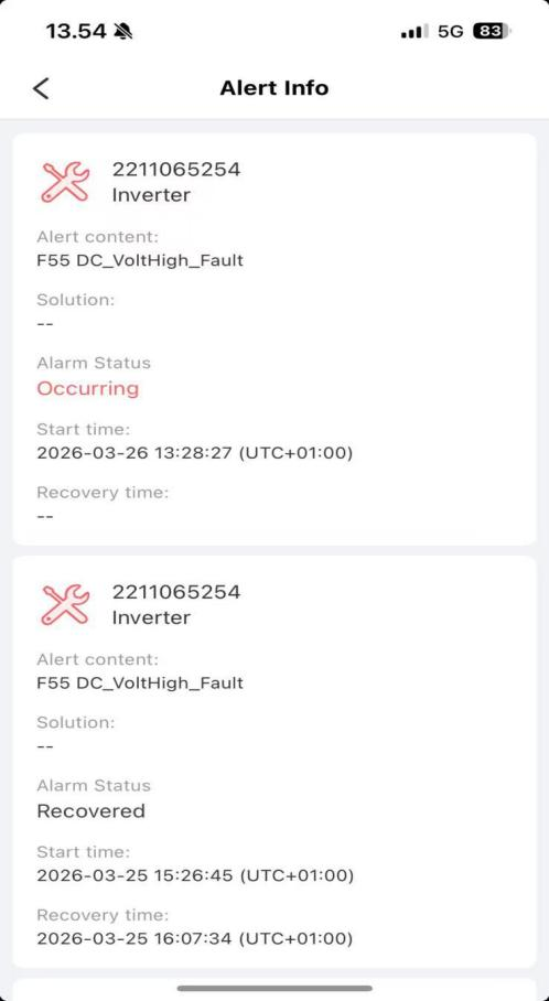 În acest caz, sistemul de stocare fotovoltaic rezidențial a încetat în mod repetat exportul în perioadele de iradiere ridicată în timpul zilei. Monitorizarea de la distanță a declanșat alarme. Cei trei pe - capturile de ecran ale site-ului formează un lanț complet de dovezi și arată clar problema principală: