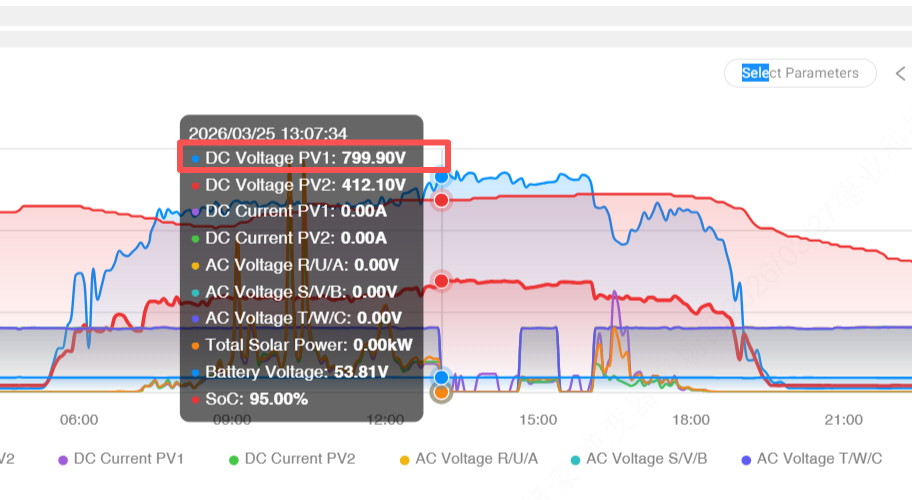 Acest caz este tipic: numărul de serie de șiruri PV1 este prea mare, astfel încât tensiunea de circuit deschis ajunge la 799,90 V, depășind cu mult invertorul ' s intrare permisă. Sub iradiere puternică, protecția la supratensiune este declanșată inevitabil. Unele cazuri arată, de asemenea, un dezechilibru între PV1 și PV2 în tipul de modul sau numărul de șiruri, ceea ce face ca un șir să depășească tensiunea de siguranță.