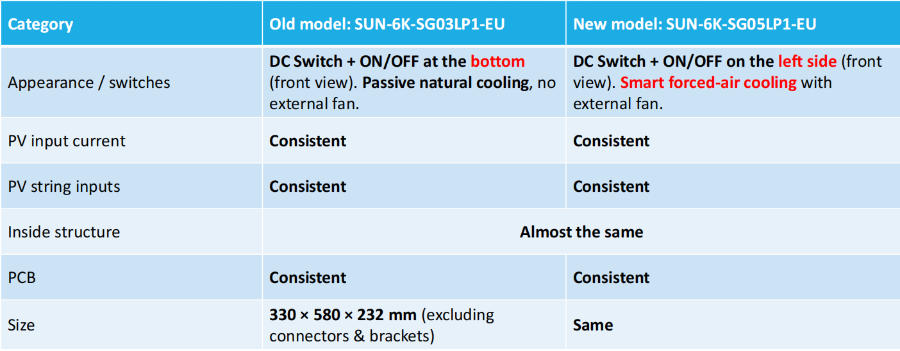 Tranziția de la modelul vechi (SUN-6K-SG03LP1-EU) la modelul nou (SUN-6K-SG05LP1-EU) reflectă îmbunătățiri în designul răcirii și al interfeței cu utilizatorul, cu adăugarea de răcire forțată cu aer și un aspect mai accesibil al comutatorului. Aceste modificări sporesc atât performanța, cât și ușurința de utilizare a invertorului. Cu toate acestea, instalatorii trebuie să țină cont de impactul potențial al zgomotului de la noul ventilator extern și să asigure un spațiu liber adecvat pentru un flux de aer eficient. Componentele electrice de bază și dimensiunile rămân în mare parte neschimbate, asigurând continuitate și compatibilitate în instalații.
